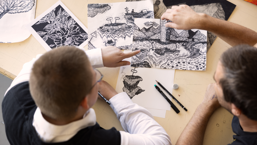 Lär dig konstgrafik genom högtryck och djuptryck. Linoleumsnitt kombineras med experimentella djuptryckstekniker som collografi, schablontryck och olika typer av blandtekniker. Trycken blir många och roliga.